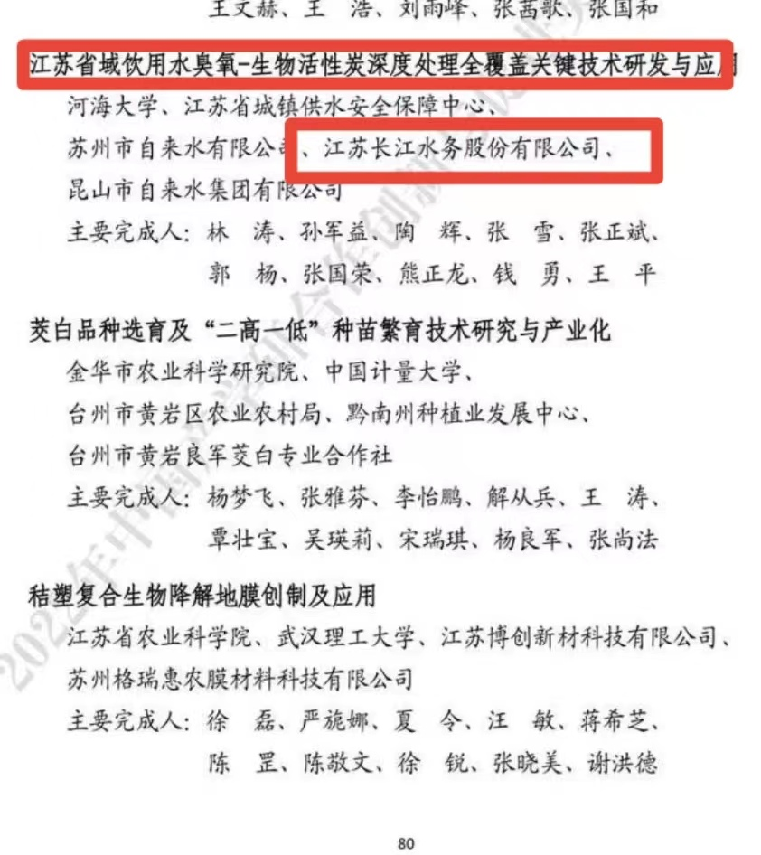 “中國(guó)產(chǎn)學(xué)研合作促進(jìn)會(huì)產(chǎn)學(xué)研合作創(chuàng)新與促進(jìn)獎(jiǎng)”由國(guó)家科技獎(jiǎng)勵(lì)工作辦公室批準(zhǔn)設(shè)立,是實(shí)施國(guó)家創(chuàng)新驅(qū)動(dòng)發(fā)展戰(zhàn)略,面向產(chǎn)學(xué)研界設(shè)立的最高榮譽(yù)獎(jiǎng)。近年來(lái),長(zhǎng)江水務(wù)不斷推動(dòng)產(chǎn)學(xué)研深度融合,與河海大學(xué)、江蘇省城鎮(zhèn)供水安全保障中心等單位聯(lián)合開(kāi)展《江蘇省域飲用水臭氧-生物活性炭深度處理全覆蓋關(guān)鍵技術(shù)研發(fā)與應(yīng)用》課題研究。長(zhǎng)江水務(wù)目前已實(shí)現(xiàn)自來(lái)水深度處理100%全覆蓋,出廠水水質(zhì)指標(biāo)全面優(yōu)于國(guó)家生活飲用水衛(wèi)生標(biāo)準(zhǔn)。臭氧一生物活性炭深度處理工藝作為當(dāng)前應(yīng)用最廣泛、技術(shù)最成熟的給水處理技術(shù),為提高揚(yáng)州人民的飲用水質(zhì)量提供了技術(shù)支撐。