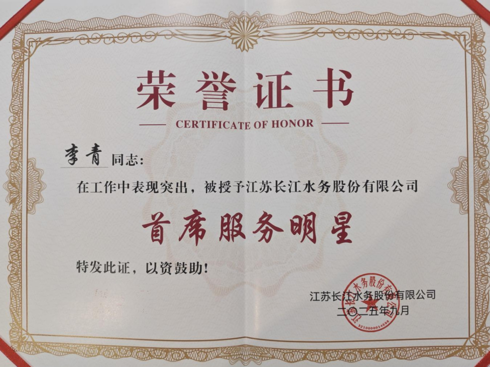 如今,公司授予李青“長江水務(wù)首席服務(wù)明星”榮譽(yù)稱號,這不僅是對他三十余載在一線崗位默默耕耘、無私奉獻(xiàn)的充分肯定,更是對他始終堅守初心、踐行服務(wù)為民宗旨崇高精神的最高贊譽(yù)。這份榮譽(yù)不僅彰顯了李青個人的成就,更凝聚著全體水務(wù)一線員工的辛勤付出。